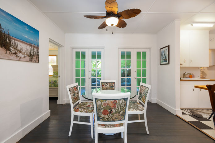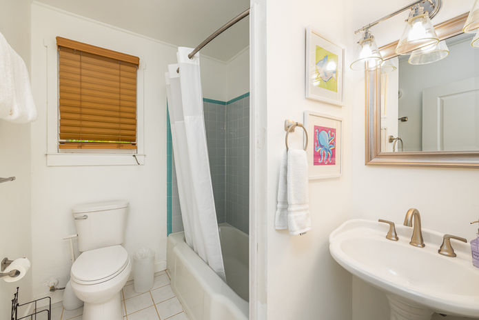 The original Florida Keys charm has been preserved and tastefully updated throughout this welcoming 2/1 1940s era cottage. Screened-in porches greet you at both entrances, each shaded by lush tropical landscaping. The cottage sleeps six with a king bed in the master bedroom and two queen beds in the second bedroom. A bathroom with a shower and tub is located off of a hallway between the two bedrooms.